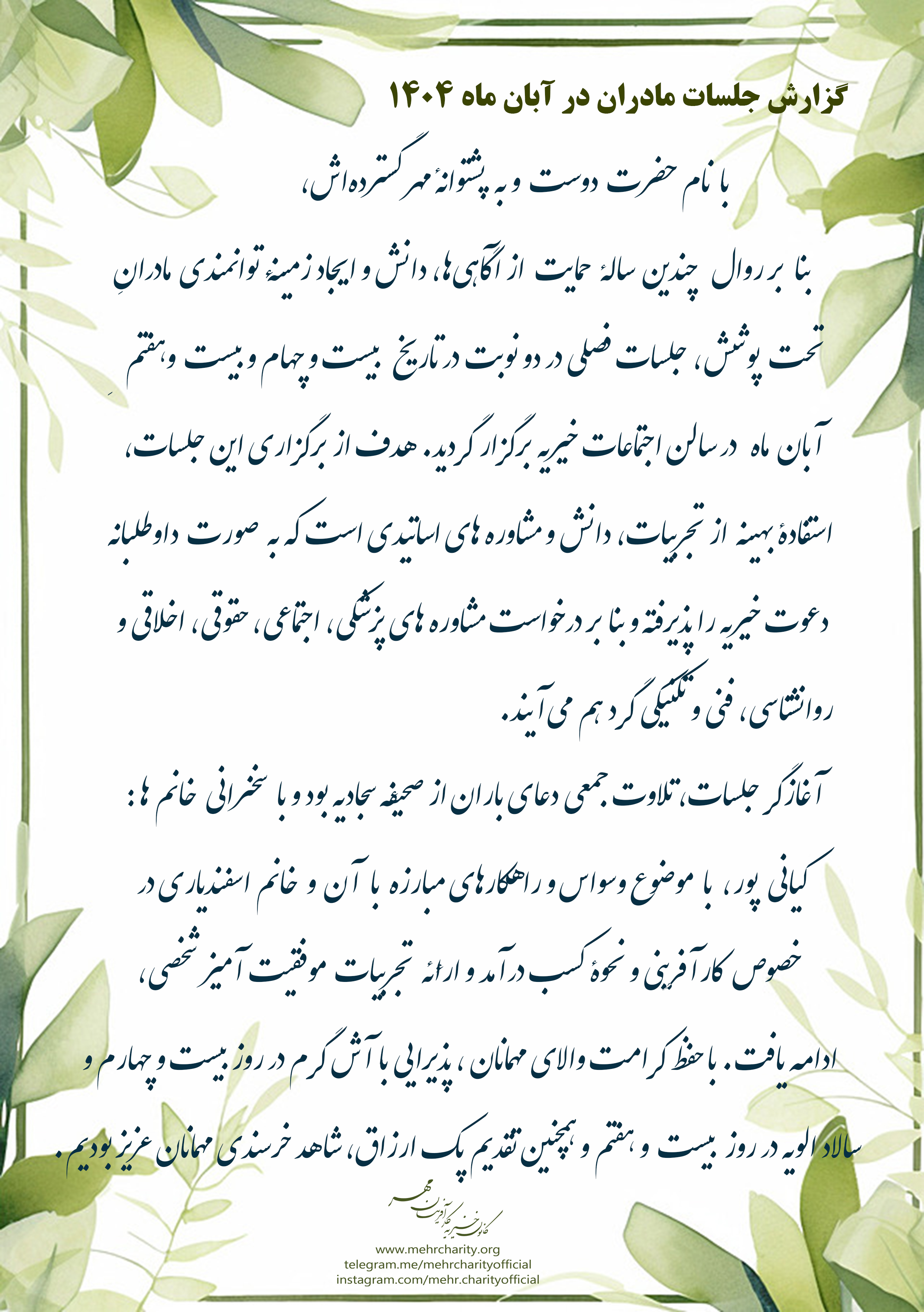 برگزاری جلسات مادران در روزهای 24 و 27 آبان ماه 1404
